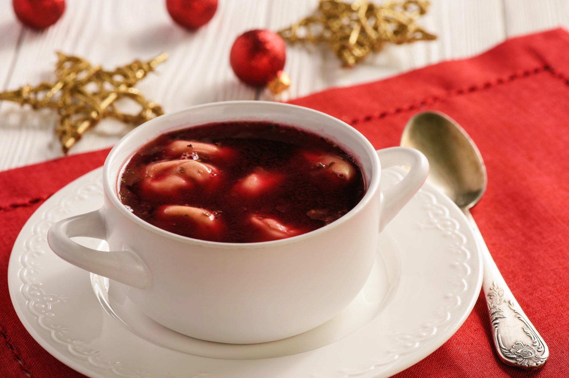 Barszcz czerwony (red beetroot soup) with uszka (small mushroom dumplings) appears on virtually every table.
